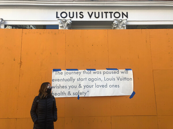 Beatriz Colomina in front of the boarded-up Louis Vuitton store in Soho, New York. Photo: Mark Wigley, March 26, 2020.