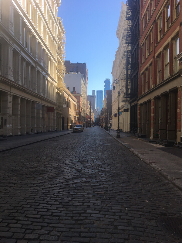 I am in New York, “the epicenter of Covid-19,” the news on TV keeps blaring, as if proud of the achievement. New York has always been excessive, so why not now? More cases, more hospitalizations, more ICU admissions, more intubations, more deaths. The news is terrifying and at the same time completely at odds with the day-to-day experience of the city, which has become so strangely quiet, so peaceful. No traffic, no construction noise, no annoying car alarms, no random screams in the middle of the night. Even the ambulances are mostly silent without cars to fight against. The birds wake us up in the morning. Who knew there were so many birds downtown? There are not even parks around here and only a few trees. But maybe they came in as residents packed up their cars and left for their houses in the countryside or the beach—leaving behind a neighborhood of empty streets, just like in the 1970s when artists occupied abandoned, barely habitable lofts and there were no stores, no restaurants, and hardly anybody in the street. These same artists, at least some of them, are still around and now much more visible with all the newcomers and tourists gone. You see them in the little Korean grocery store on the corner, with their masks on, carefully selecting their vegetables, or walking slowly in the street with their dogs, or picking up take-out from restaurants. But it is the buildings themselves that have become the main actors again, the real occupants of the streets. The character of each one jumps out, etched in astonishing detail, constantly changing with the light. Could that beautiful abandoned New York return?