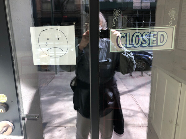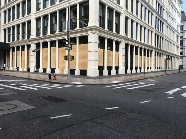 All luxury shops around here have started to board up their windows as if a hurricane was coming. Do they know something we don’t? Are they expecting civilian unrest, looting, as during the New York Blackout of 1977? Or is the city just wearing a mask like the rest of us? Think of all the doors that are closed, all the blinds that are down. The city has sealed itself—everything withdrawn behind a new façade.