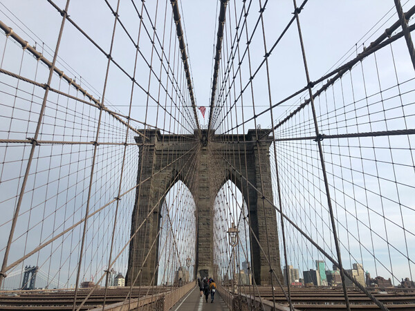 Beatriz Colomina and Andrea Marpillero-Colomina walking across the Brooklyn bridge. Photo: Mark Wigley, March 18, 2020.