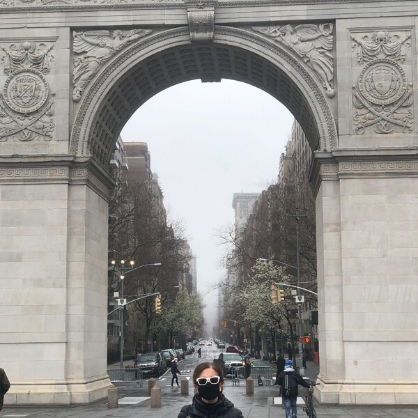 Beatriz Colomina at Washington Square Arch with an almost empty 5th avenue. Photo: Mark Wigley, March 29, 2020.