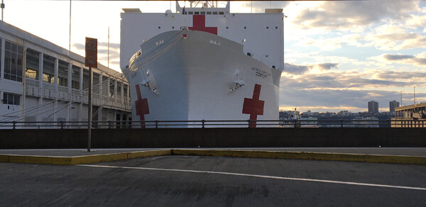 The Comfort hospital ship has arrived. Mark and I walked all the way up along the Hudson river to welcome it, but it was also very quiet, docked in Pier 90 around 49th street, sitting behind a veil of green net in some kind of majestic silence. Nothing to see, from there down to the Javits Convention Center, which has been turned into a hospital. The Army Corps of Engineers were moving around deep in the building’s vast interior like miniature figures, but still it was all very quiet. Some emergency vehicles idling in the streets outside, as if waiting for the unknown.