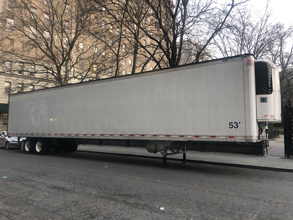 Refrigerator truck acting as morgue parked in front of hospital on 1st Avenue. Photo: Mark Wigley, April 2, 2020.