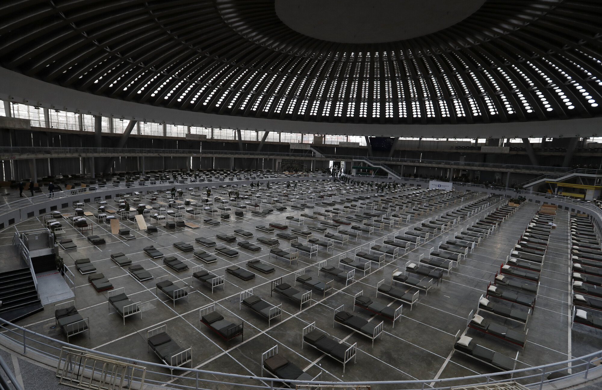 Serbian soldiers set up beds for treatment of possible COVID-19 infected patients inside of the Belgrade Fair, Serbia, March 24, 2020. Photo: AP Photo/Darko Vojinovic.